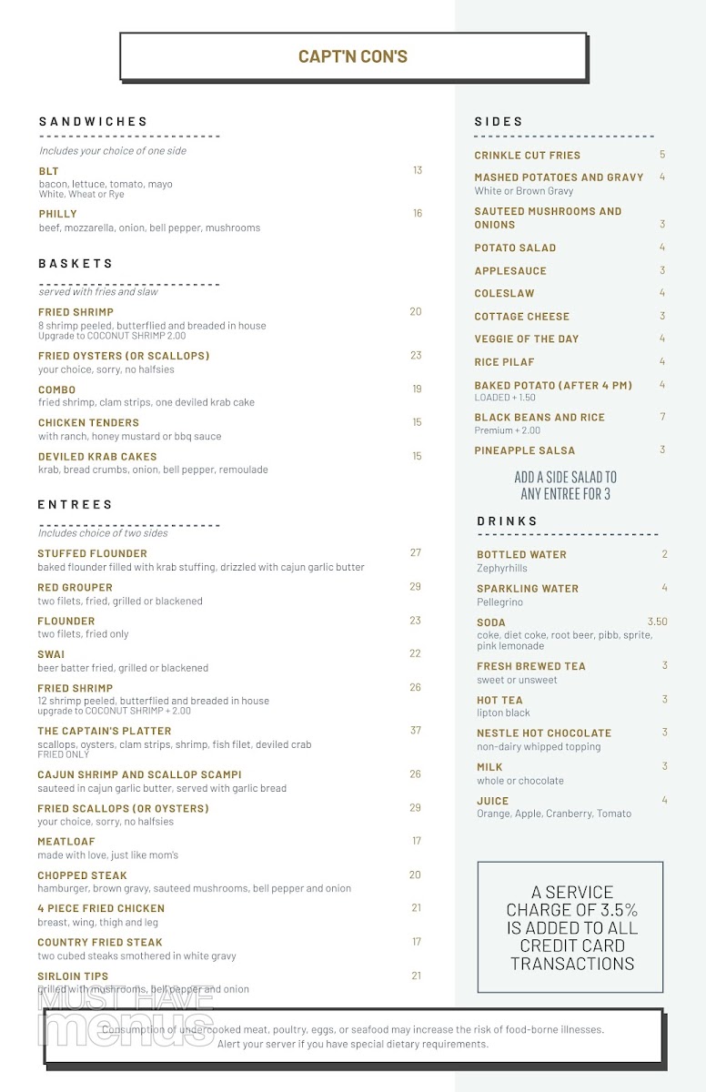 At Capt'n Con's, the menu boasts a variety of delicious options that cater to both seafood enthusiasts and comfort food aficionados alike. Specialties like the AYCE (All You Can Eat) Catfish for just US$15.95 and Steamed Shrimp at US$19.50 are crowd favorites. The generous portions ensure that no one leaves hungry. For meat lovers, options like Sirloin or 1/2 Roasted Chicken with dressing priced at US$10.50, promise satisfaction for all.