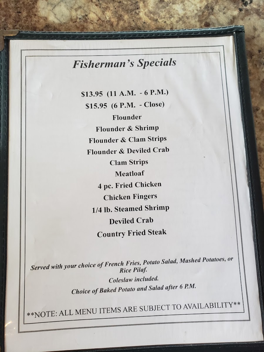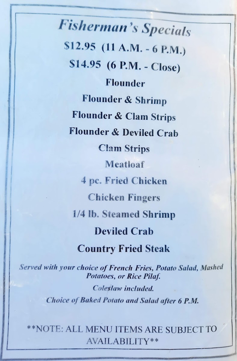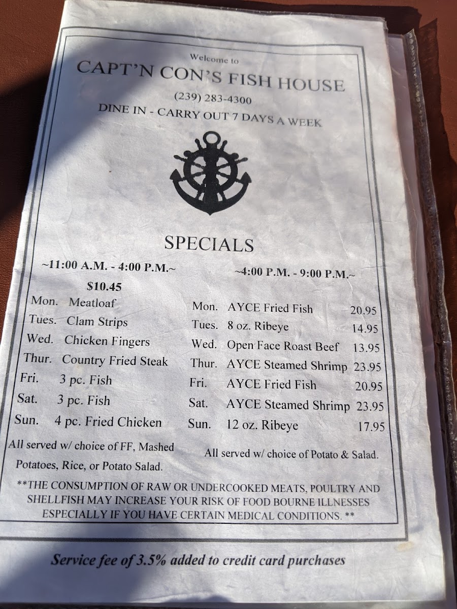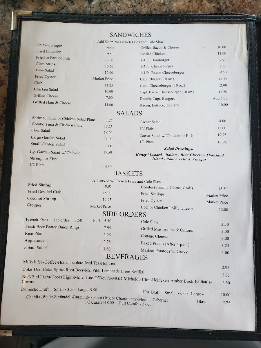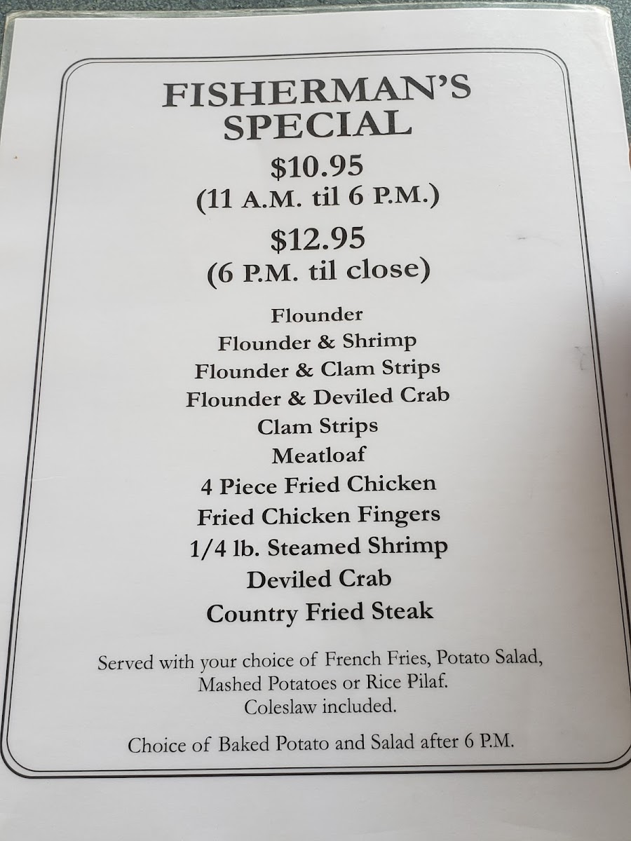 “ Old school quaint, no frills place and food with an accompaniment of Florida charm from the people serving. Wonderful location, this isn't Michelin dining, but who wants Michelin in Florida?? It was quiet when we arrived, we were met with a smile, and everything came out in short order. The captains plate was massive. I could not eat it all. It was all fried, but it states that on the menu, it was all good, accompanied by a nice cocktail sauce (they also have tartar at each table) My wife had roast beef with gravy which she loved. And we took home rhubarb pie to have another day. These guys were hit hard by Ian, not as hard as many, but hard enough and they are still managing through damage, and kudos to them it doesn't show one bit. We will be back. I want to try the mussels. ”