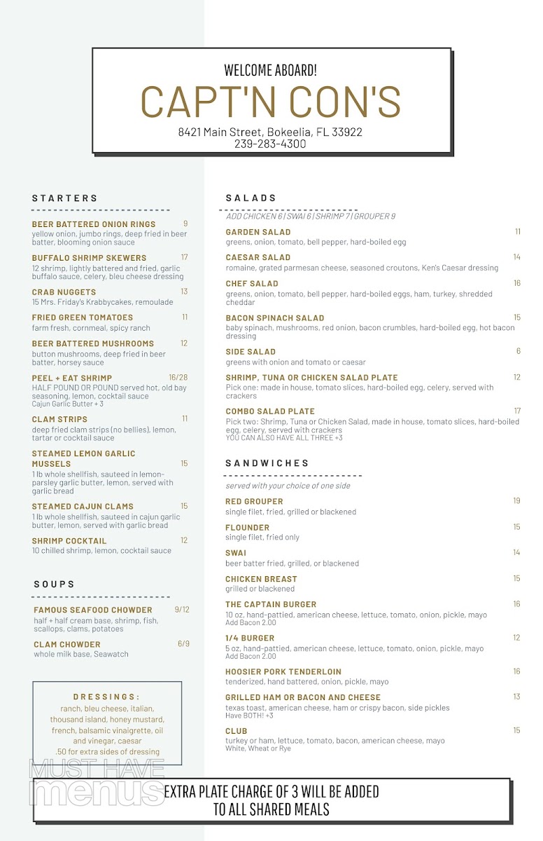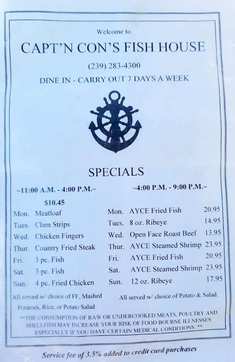 Welcome to Capt'n Con's Fish House, a delightful culinary haven located in the heart of Bokeelia, Florida. Nestled at 8421 Main St, this seafood gem invites food lovers to experience an authentic taste of local flavors and warm hospitality. The restaurant's charming ambiance, characterized by its quaint decor and outdoor seating, creates the perfect setting for a casual yet memorable dining experience.